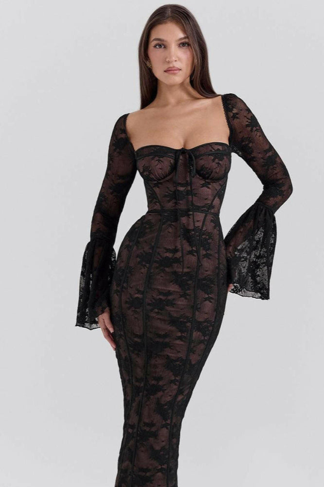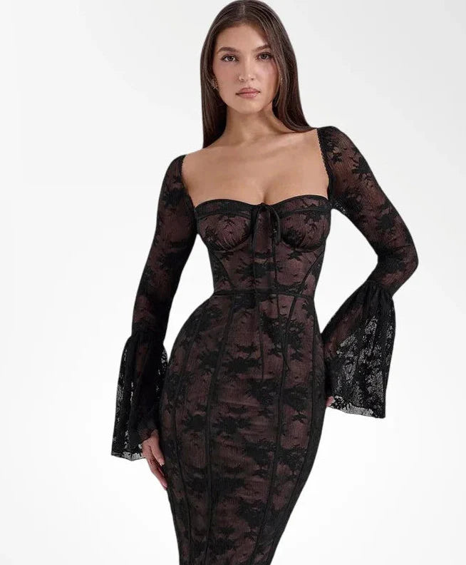 Gracias a su escote de corazón cuadrado con acabado en lazo, nuestro vestido "Allegra", aporta un toque elegante a tu look, mientras que su tejido de algodón y poliéster; Ligero y elástico, te hacen ver más sexy que nunca. Sus mangas largas de encaje con muñeca campanada combinan la elegancia tradicional con un toque moderno.