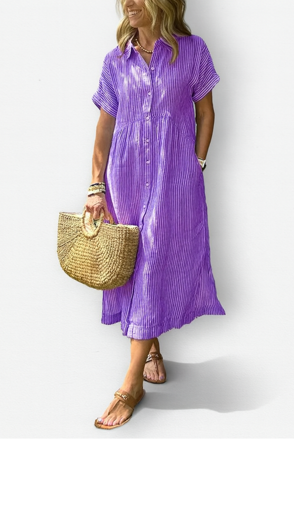 El vestido cuenta con mangas cortas, cuello y una botonadura central – ideal para un look femenino, cuidado y sin esfuerzo. El ajuste ligeramente entallado y la falda fluida crean una silueta favorecedora.