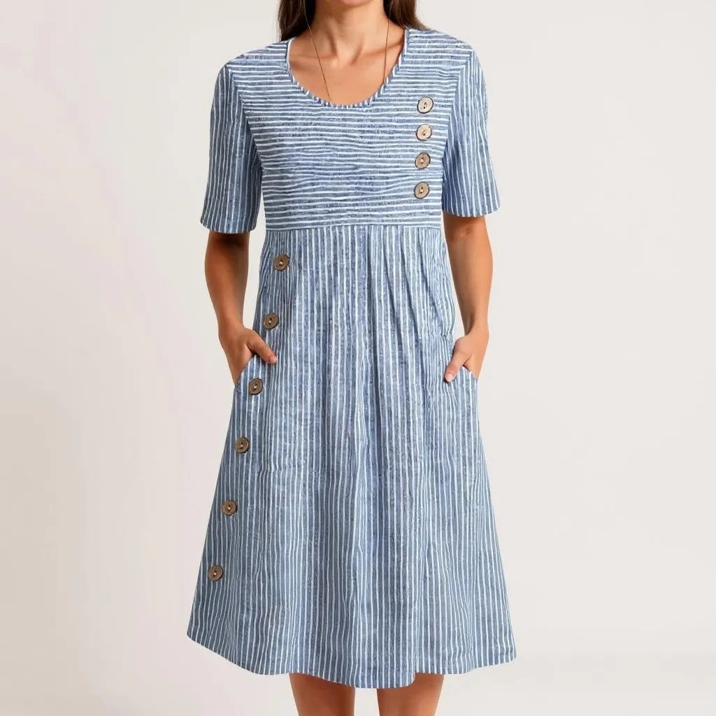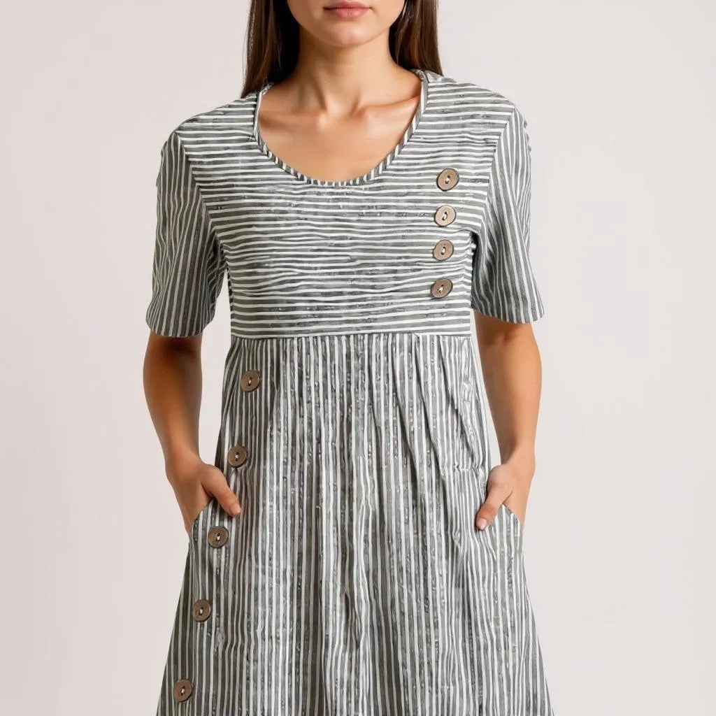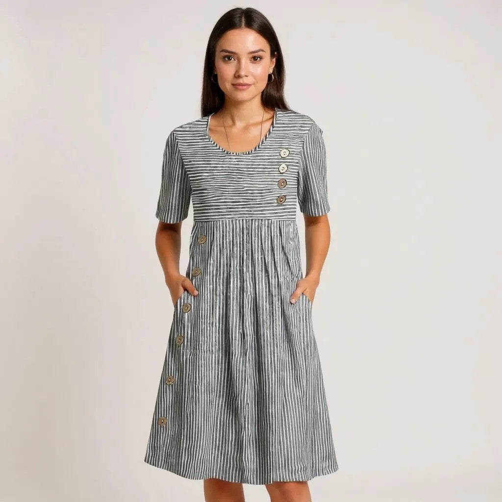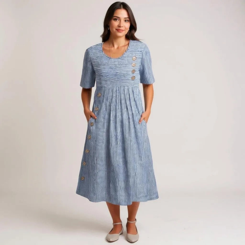 Permítete disfrutar de la ligereza, la comodidad y el estilo atemporal con Arja, un elegante vestido veraniego de rayas. Una opción fresca y favorecedora para los días calurosos en los que quieres sentirte bien y lucir espectacular. Perfecto para mujeres que desean disimular el abdomen sin renunciar a la elegancia.